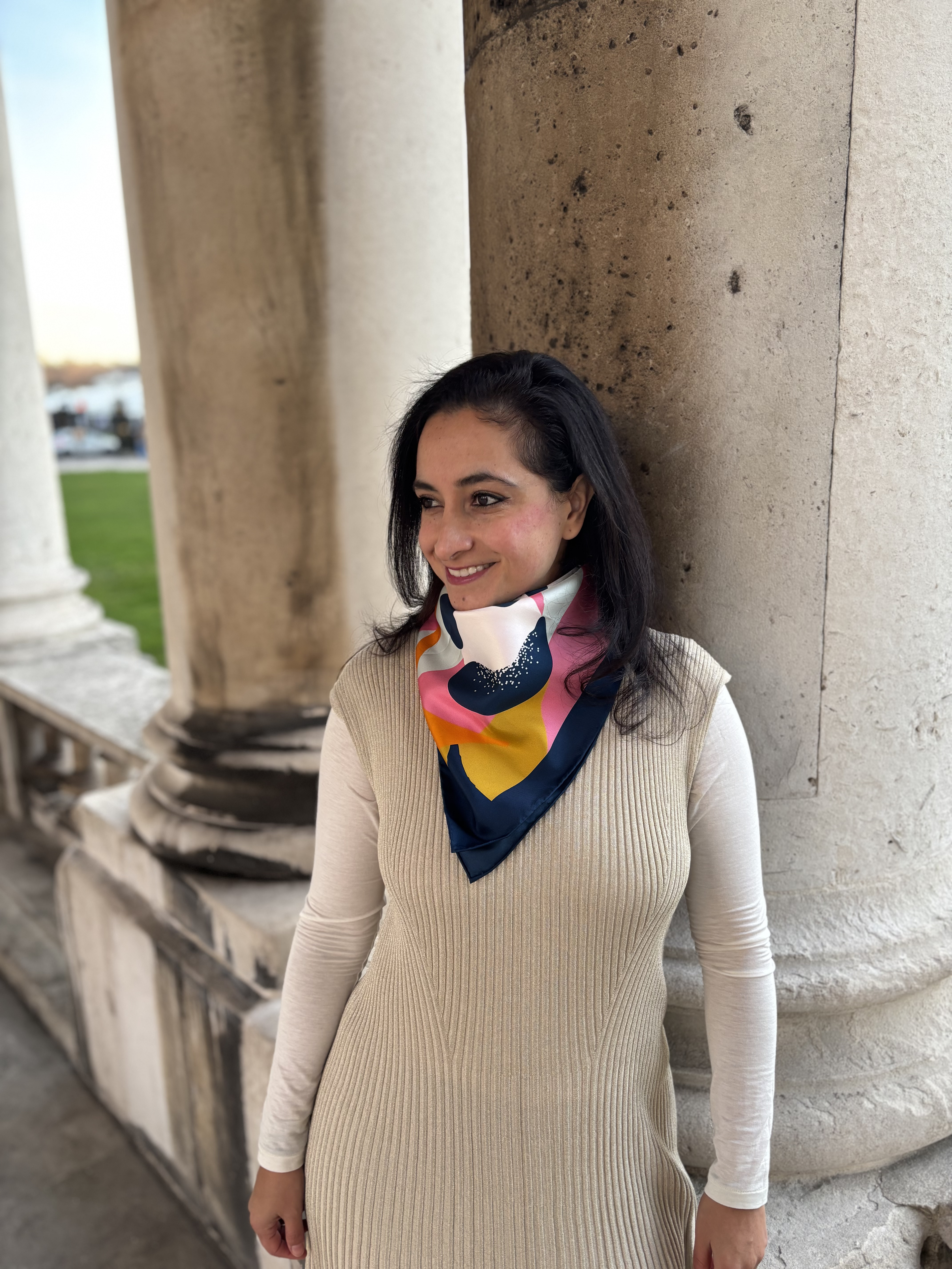 Elegant silk and wool scarves to elevate your every day. Silk scarves that turn heads—bold, effortless, and made to move with you. Liz, originally from Mexico, is passionate about fashion and textiles. However, she has sensitive skin, which prevents her from wearing many beautiful fabrics, leaving silk as her only option. Liz believes that silk can be affordable for many people, and since she has experienced the exquisite sensation of silk against her skin, she feels it should be a luxury that everyone, especially those with sensitive skin, can enjoy.