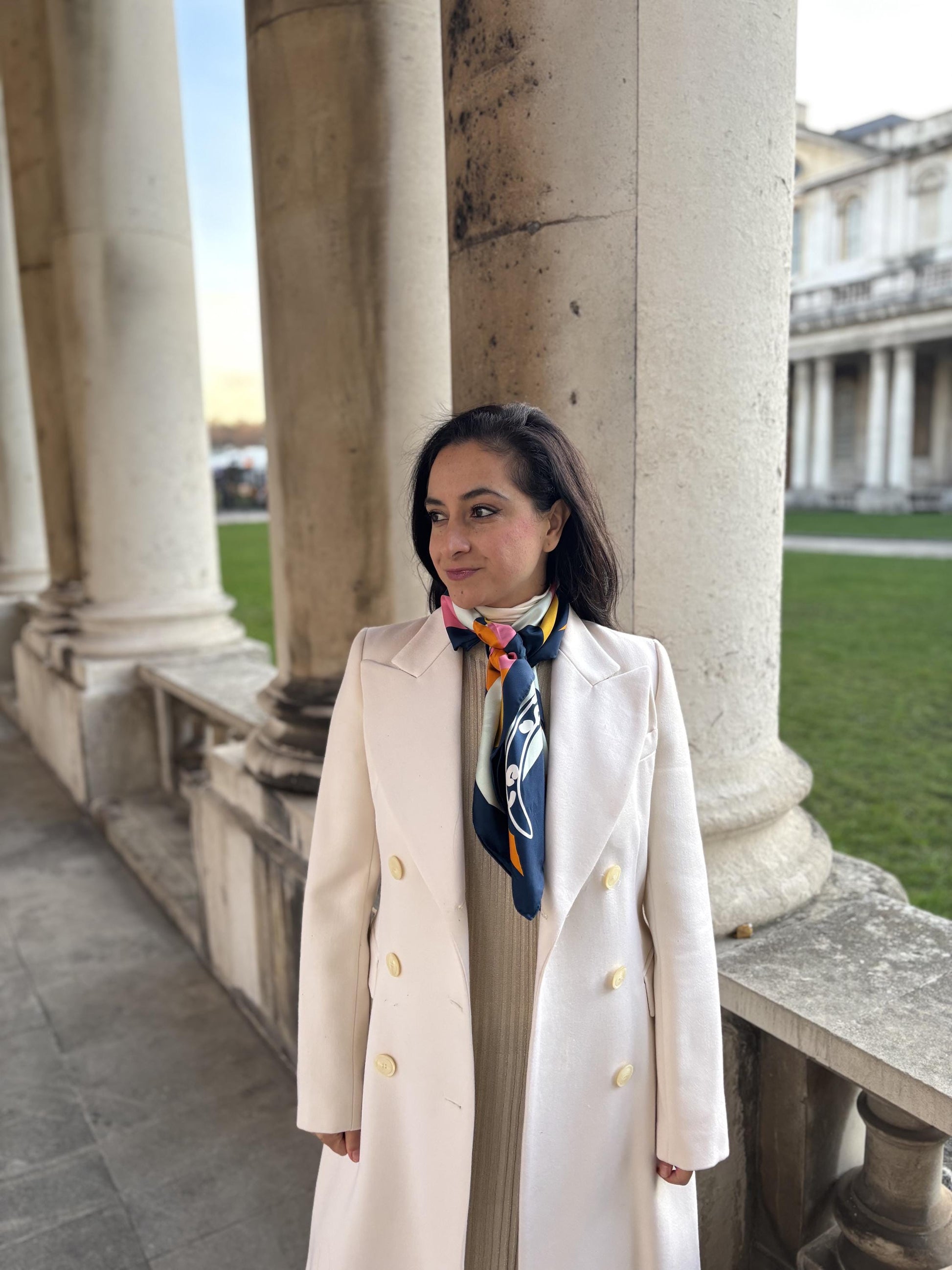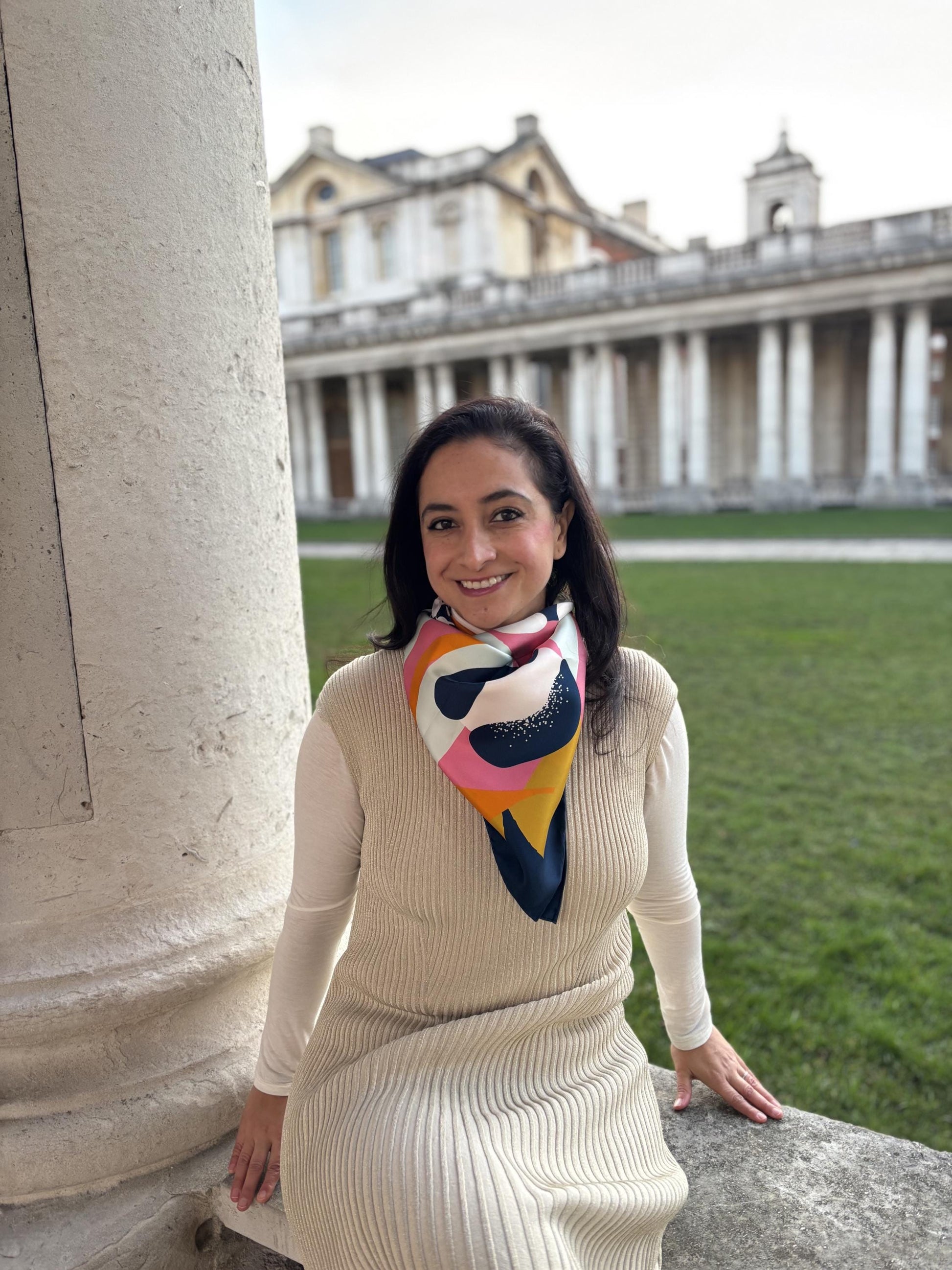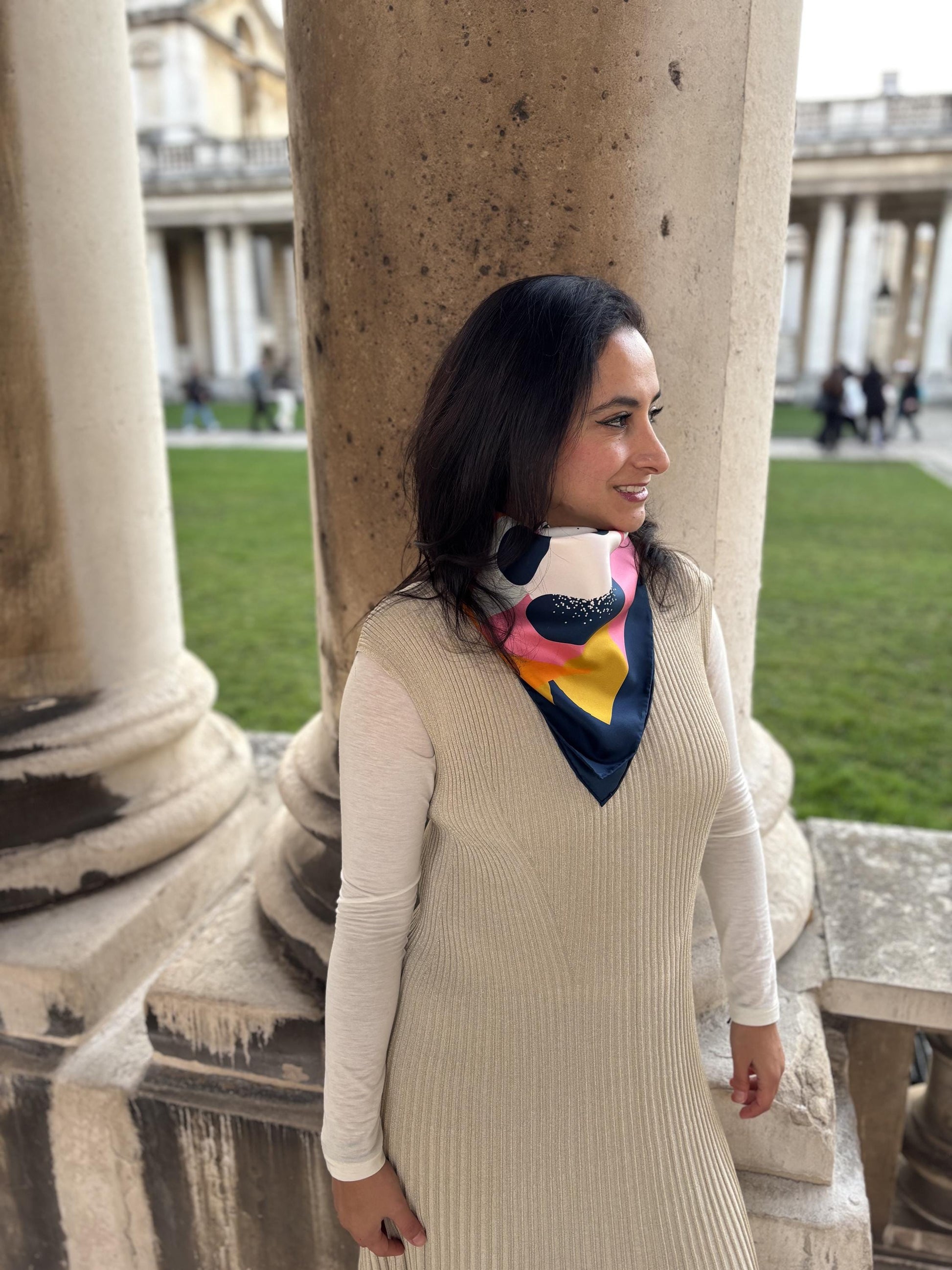 This statement silk scarf features a vibrant, contemporary design with stylised leopards dancing across a bold pink and golden background. The contrast of deep navy details against warm tones creates a striking yet refined piece that instantly elevates any outfit.