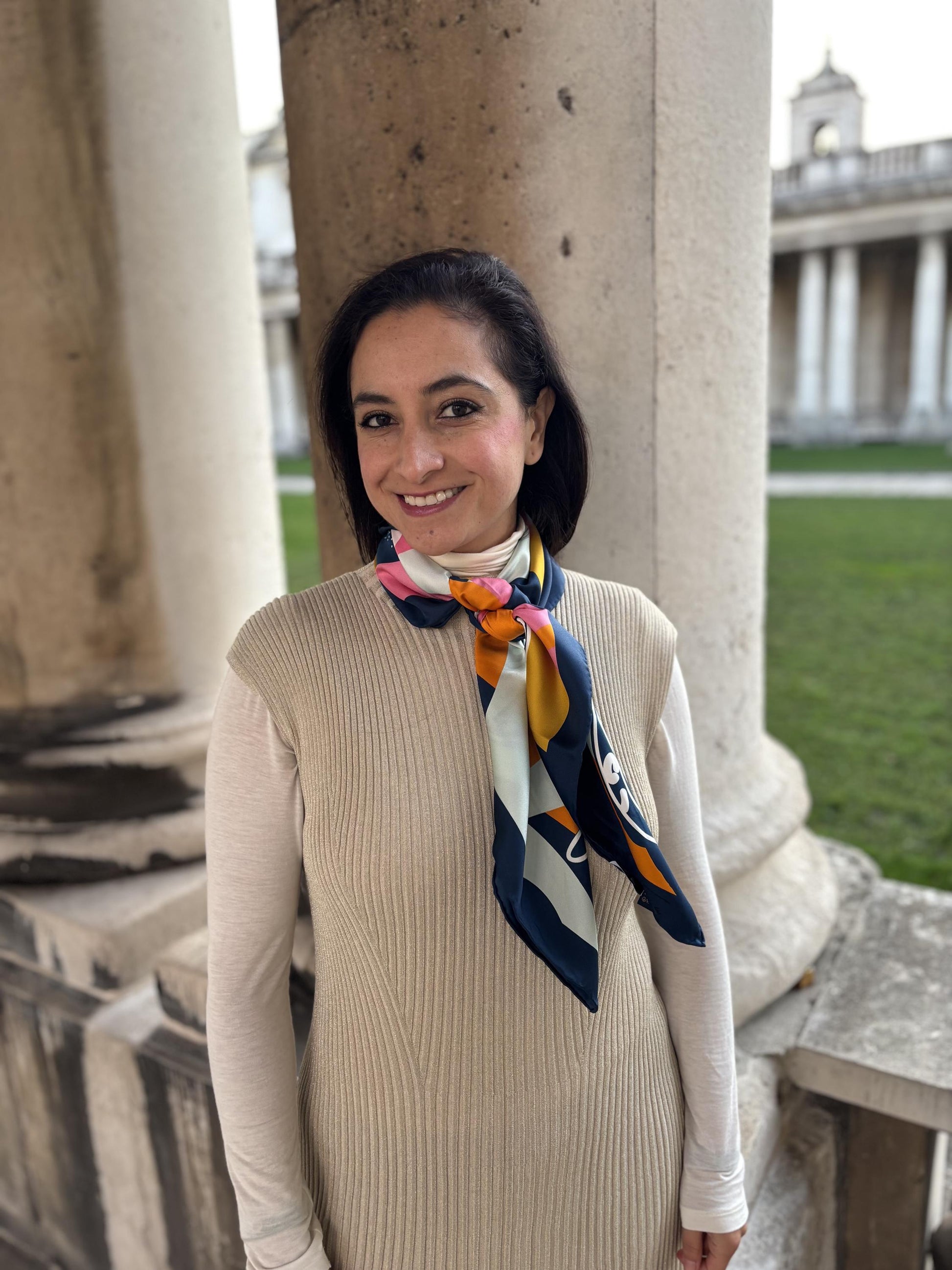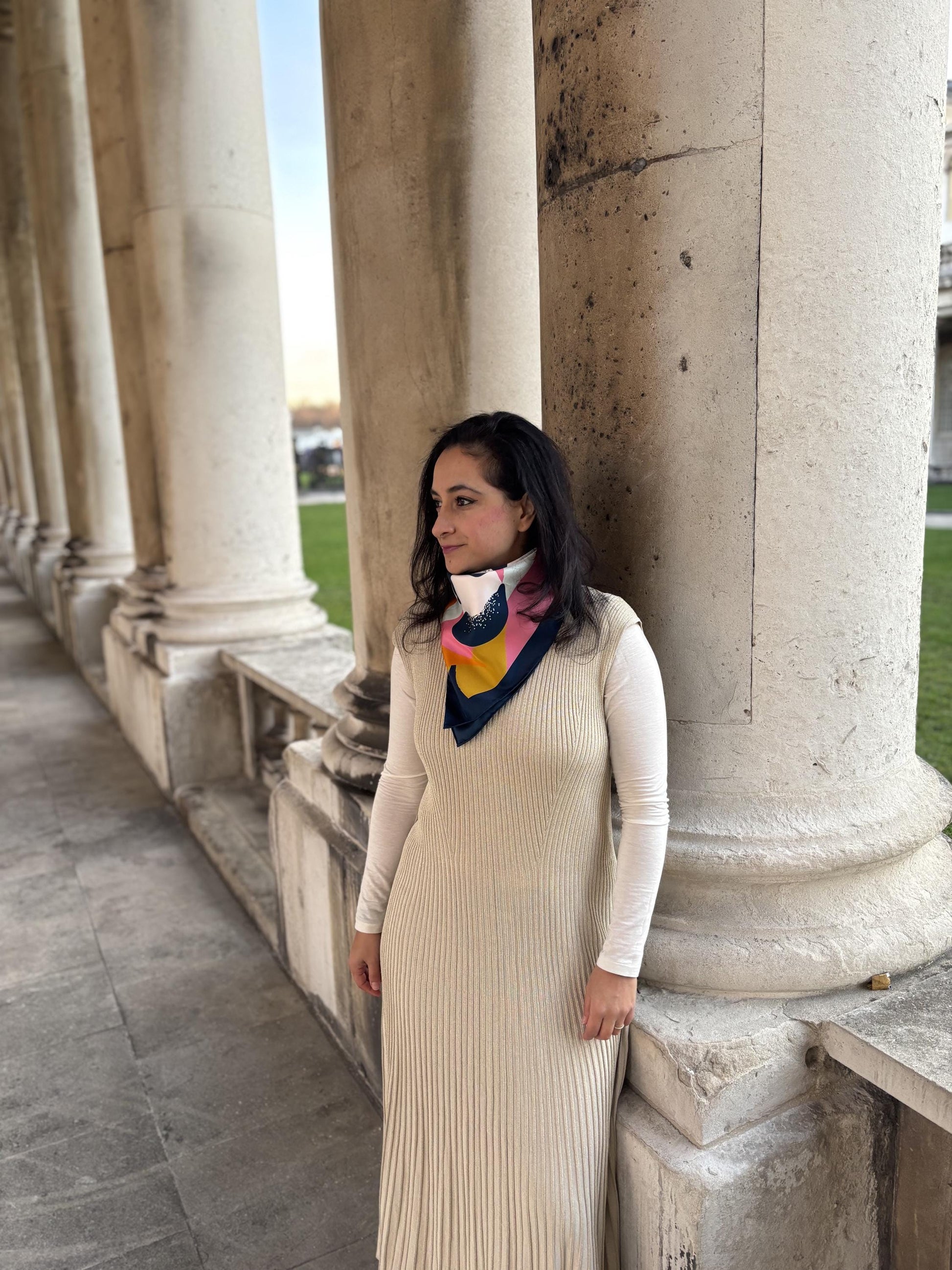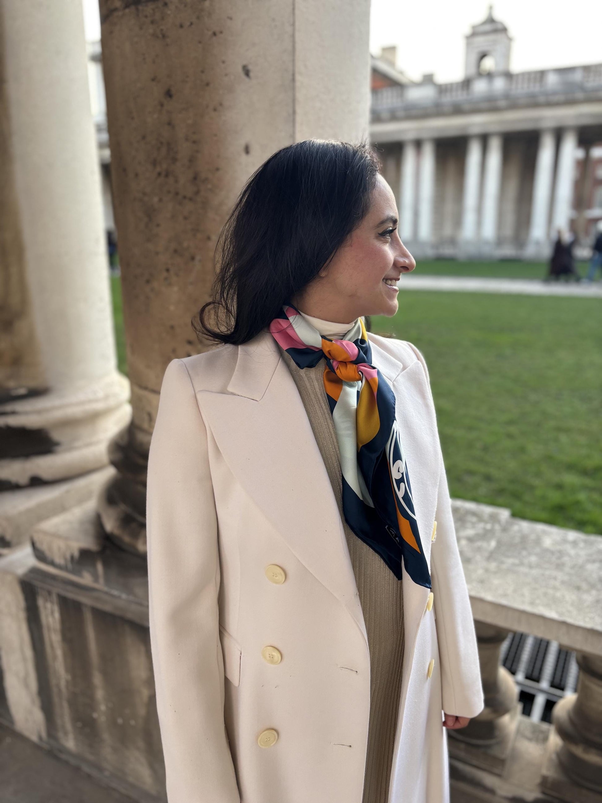 This statement silk scarf features a vibrant, contemporary design with stylised leopards dancing across a bold pink and golden background. The contrast of deep navy details against warm tones creates a striking yet refined piece that instantly elevates any outfit.