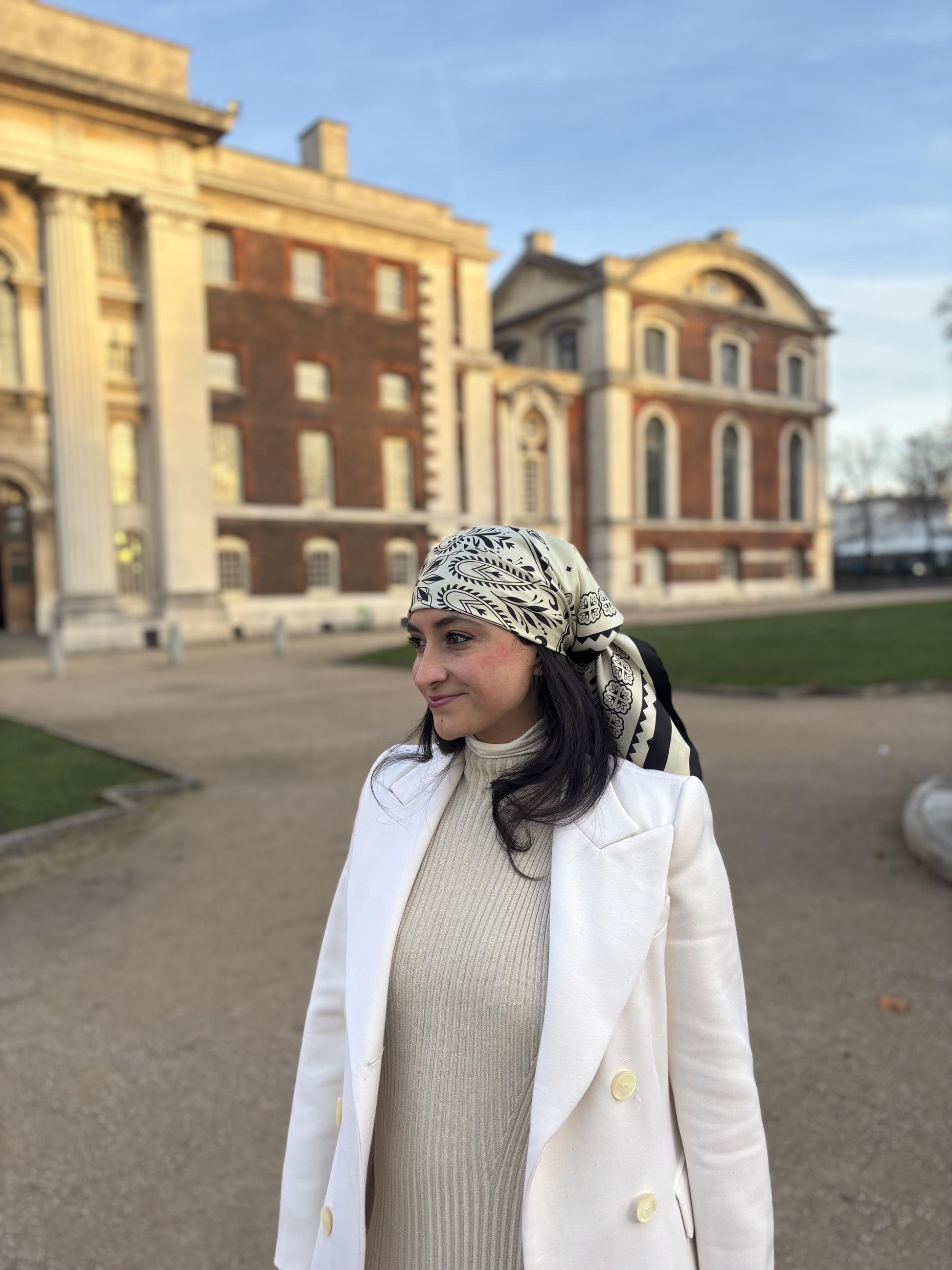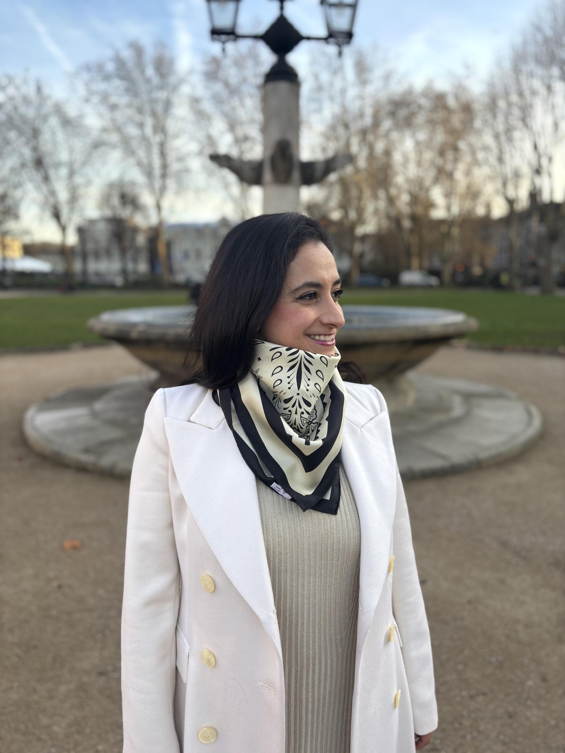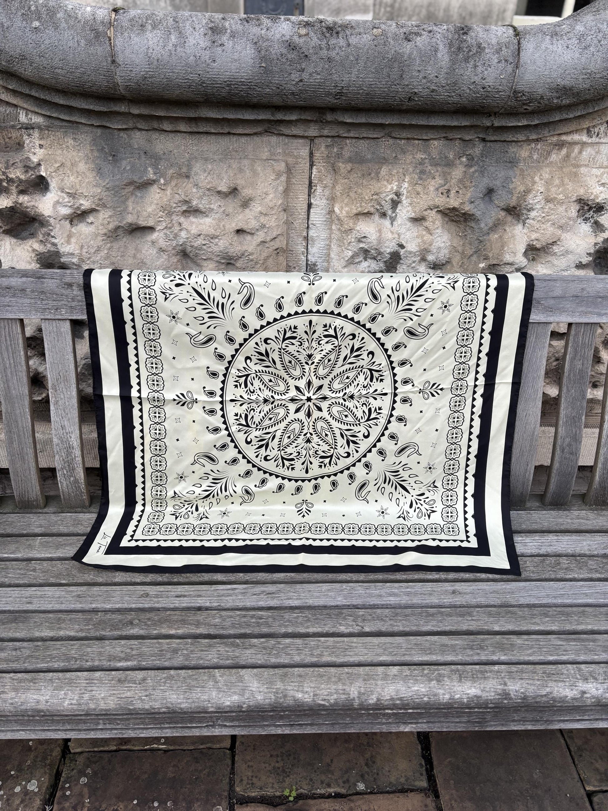 Add a touch of timeless charm to your look with this beautifully detailed square scarf. Featuring an intricate folk-inspired floral mandala at the center, surrounded by delicate botanical motifs and a classic border, this scarf blends vintage elegance with modern versatility. The neutral beige and black color palette makes it easy to style with any outfit, all year round.