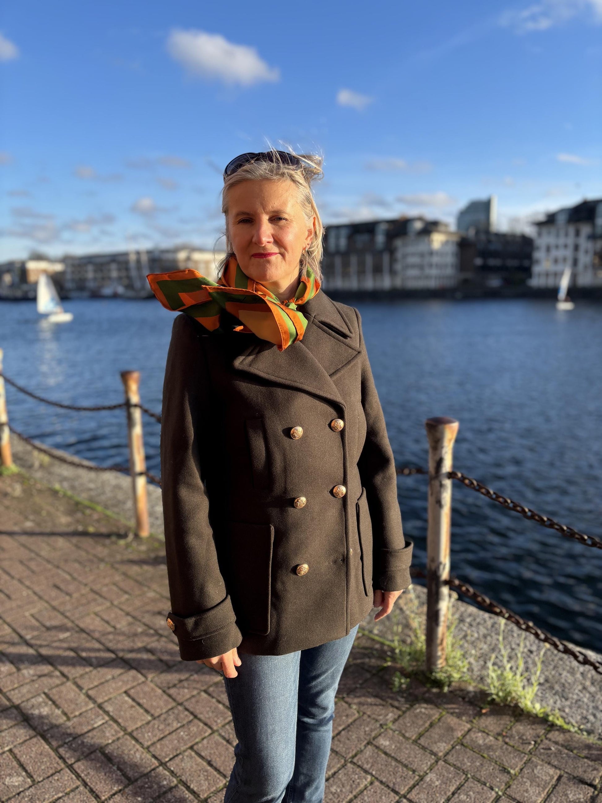 100% silk twill This silk scarf features a striking tropical composition, surrounded by abstract geometric panels and lush botanical elements. The warm palette of terracotta, burnt orange, olive green and soft blush pink creates a sophisticated, yet vibrant look inspired by nature and modern art. Made from smooth, lightweight silk, this scarf drapes beautifully and adds an instant statement to both neutral and colourful outfits. The balanced mix of structured geometry and organic shapes makes it a timeless piece with contemporary character. Wear it around your neck, styled as a headscarf, or tied to your favourite bag for an elegant tropical touch.