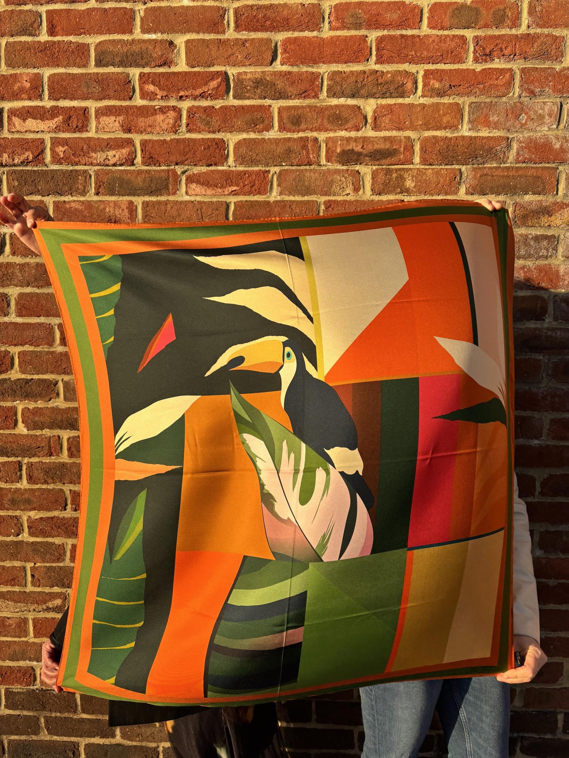 Details • 100% silk twill • Lightweight, soft and fluid feel • Original toucan and botanical illustration • Warm earthy tones: terracotta, orange, green and blush • Neatly finished edges